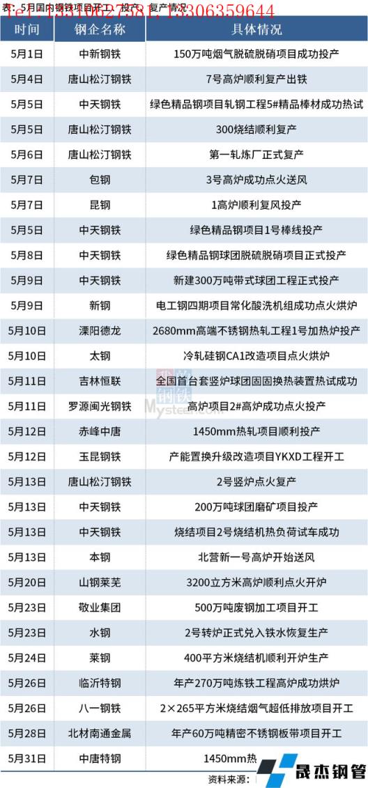 免責聲明:本網站(山東聊城晟杰無縫鋼管廠m.vsocial.cn)刊載的“5月國內29個鋼鐵項目開工、投產或復產”等均源于網絡,版權歸原作者所有,且僅代表原作者觀點,本文所載信息僅供參考。轉載僅為學習與交流之目的,如無意中侵犯您的合法權益,請及時聯系刪除。本網站刊登此篇文章并不意味著本站贊同其觀點或證實其內容的真實性,我們不對其科學性、嚴肅性等作任何形式的保證。如果侵犯了您的版權,請盡快聯系我們予以撤銷,謝謝合作!
