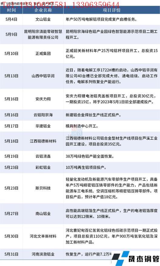 免責聲明:本網站(山東聊城晟杰無縫鋼管廠m.vsocial.cn)刊載的“5月國內14個鋁項目開工、投產或復產”等均源于網絡,版權歸原作者所有,且僅代表原作者觀點,本文所載信息僅供參考。轉載僅為學習與交流之目的,如無意中侵犯您的合法權益,請及時聯系刪除。本網站刊登此篇文章并不意味著本站贊同其觀點或證實其內容的真實性,我們不對其科學性、嚴肅性等作任何形式的保證。如果侵犯了您的版權,請盡快聯系我們予以撤銷,謝謝合作!