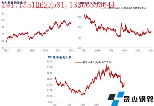在此次加息周期中,美元、黃金和原油同時上漲,期間漲幅分別達到8.25%、4.78%和54.12%。其中黃金走勢較為特殊,1999年金價處于歷史低谷,9月26日歐洲15國央行協議限制黃金拋售量后金價飆漲,隨后金價隨著美元指數走強而震蕩回落,整體上加息期間小幅上漲。