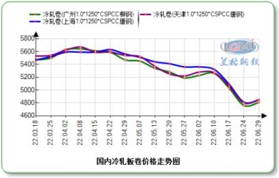 云商平臺(tái)監(jiān)測(cè)數(shù)據(jù)顯示,截至6月29日,全國(guó)1.0mm冷軋市場(chǎng)均價(jià)為4922元(噸價(jià),下同),比5月末下跌455元。主導(dǎo)城市上海唐鋼1.0mm冷軋卷市場(chǎng)價(jià)格為4850元,比5月末下跌510元;北京首鋼1.0mm冷軋卷5000元,比5月末下調(diào)430元;天津唐鋼1.0mm冷軋大卷4850元,比5月末下跌370元。