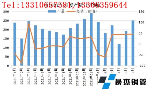 云商平臺監測國內35家熱卷企業產量數據來看,無縫鋼管廠家產量均值為263.53萬噸,二季度熱卷產量明顯走高。最高點出現在5月中旬產量295.4萬噸,最低值出現在2月初為243.67萬噸。值得注意的是,6月份成材深跌熱卷利潤跌至負值區間,雖無縫鋼管廠家不斷傳出減產傳言,但熱卷產量整體減產力度不及預期。六月份熱卷產量均值為272.69萬噸,僅環比微降8.44萬噸。
