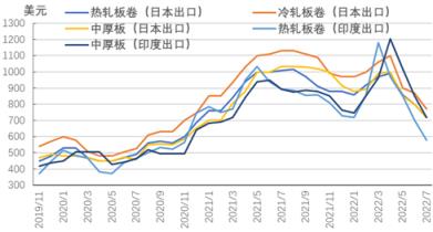 7月份,亞洲扁平材市場價格繼續下跌。其中,中國市場明顯下跌,云商平臺監測數據顯示,7月底,中國國內板材價格為4291元人民幣,比上月底下跌449元人民幣;日本出口報價普遍下調,熱卷、冷卷、熱鍍鋅和中厚板價格分別下跌80美元、100美元、50美元和80美元;印度出口報價大幅下調,熱卷、熱鍍鋅和中厚板價格分別下跌120美元、160美元和130美元。