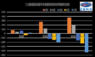 7月份由于原料庫存周期不同,成本下降幅度有明顯差異,厚壁鋼管市場均值震蕩下行,7月份品種噸鋼毛利相比上月表現分化。以三級螺紋鋼為例,以即期原料成本測算7月份毛利空間較上月上升49元/噸,由虧轉盈;而以兩周、四周原料庫存周期測算7月份毛利空間均在虧損區間繼續下行,兩周原料庫存周期測算虧損幅度較上月擴大53元/噸,以四周原料庫存周期測算7月份虧損空間較上月擴大206元/噸(詳見圖2)。
